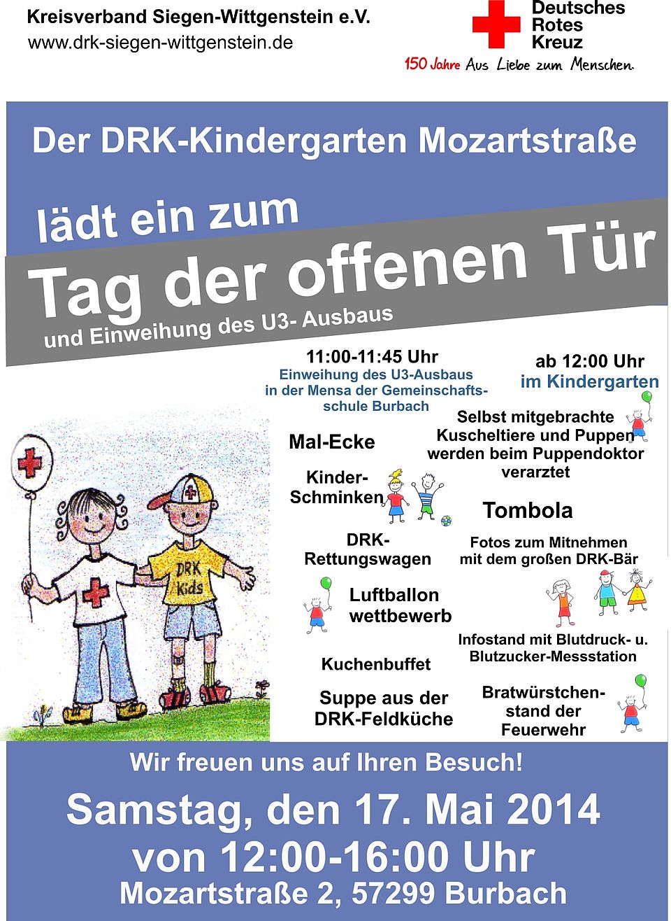 DRK-Kindergarten Mozartstraße, wird nun der U-3 Anbau der Öffentlichkeit vorgestellt. Für ein abwechslungsreiches Programm sorgen neben dem DRK-Ortsverein Burbach, die DRK-Diakonie Sozialstation Burbach, Feuerwehr Burbach und die Kindergarteneltern und Erzieher.