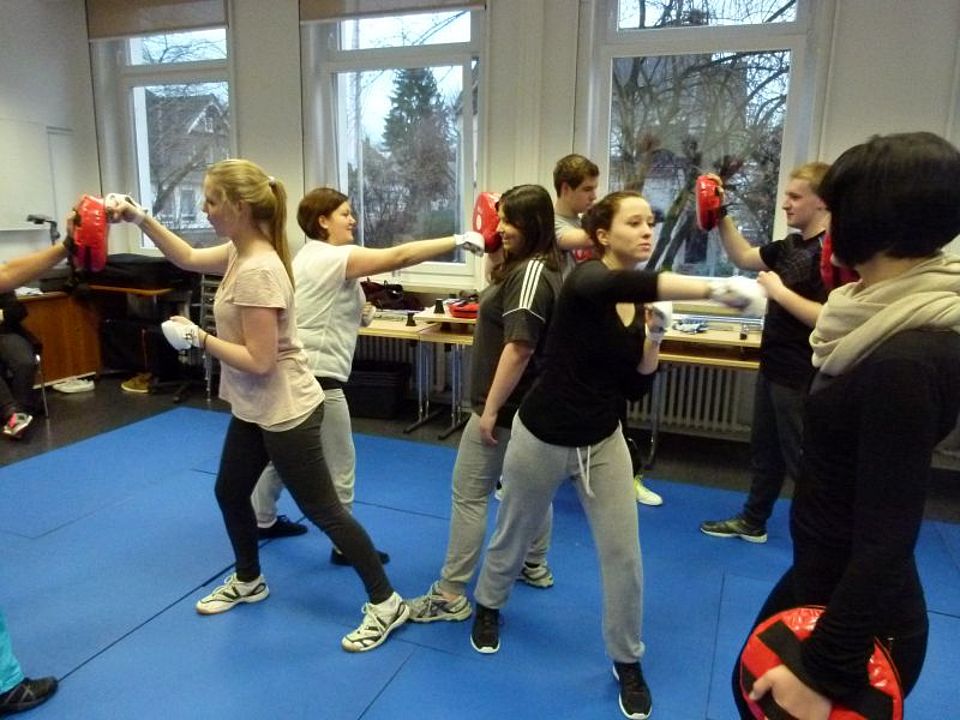Im Rahmen eines zweitätigen Deeskalationstrainings, bestehend aus Theorie und Praxis, ging es darum, Situationen mit aggressiven Personen einzuschätzen und zu entschärfen. Dabei lernten die Teilnehmer beispielsweise verschiedene Möglichkeiten kennen, die eigene Körperhaltung effektiv einzusetzen. Es ging immer um die Frage: Wie kann ich mich und andere Personen vor Übergriffen schützen? „Dabei geht es nicht darum sofort Gewalt einzusetzen, vielmehr sollen kritische Situationen viermieden oder entschärft werden und die Zivilcourage gefördert werden. Aber natürlich sollte jeder im Notfall bereit sein, sich wehren zu können“ so Ausbildungsleiter Boris Wißmann. Daher war die Selbstverteidigung ein weiterer Schwerpunkt des Lehrgangs. Mit Hilfe von Handschuhen und Pratzen konnten die Teilnehmer in zweier Teams lernen, den eigenen Körper zu schützen und sich gegenüber einem bedrohlichen Gegner mit Hilfe von bestimmten Handgriffen zu wehren.