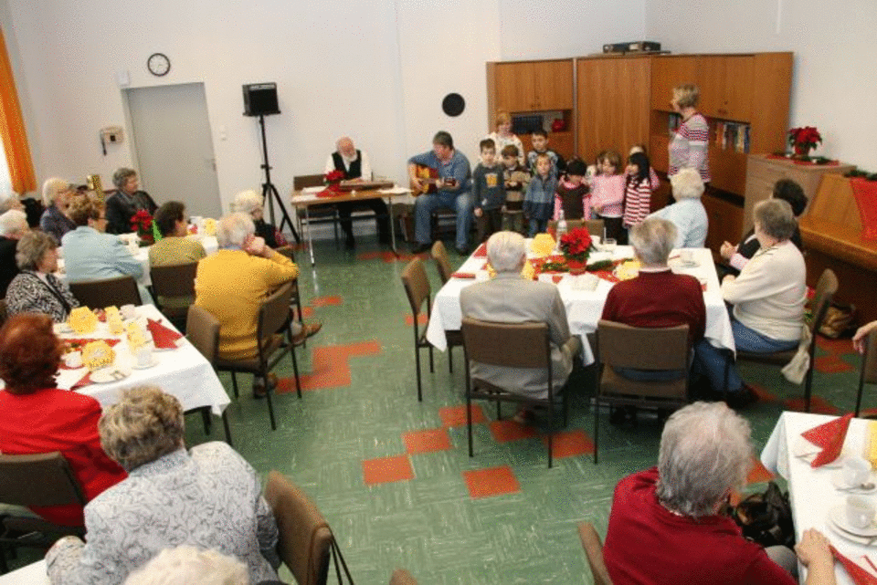 Bei Kaffee und selbst gebackenen Torten sangen die 34 eingeladenen Senioren die schönsten Weihnachtslieder und verfolgten die liebevoll einstudierten und aufgeführten Sketche der ehrenamtlichen DRK-Helferinnen. Die musikalische Begleitung übernahm Walter Lepschy auf der Zitter und Gerhard Kneppe am Akkordeon. Ein Höhepunkt war der Auftritt der Kindergartenkinder aus dem „Kindergarten Herrenfeld“. Die kleinen „Musiker“ sangen einstudierte Lieder und trugen dem begeisterten Publikum Weihnachtsgedichte vor, die zum Mitklatschen und mitsingen animierten.