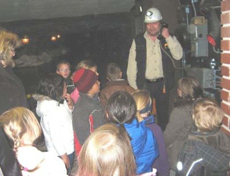 Nach einer ausgiebigen Stärkung wurde es noch einmal spannend. Man stieg in die Welt „unter Tage“ hinab. Dort konnten die Kinder erfahren, wie die Bergarbeiter damals gearbeitet haben. Es ging durch enge, dunkle Gänge zu Lademaschinen, Pressluftbohrern und anderen Maschinen, zu denen man die Originalgeräusche vom Tonband hören konnte.