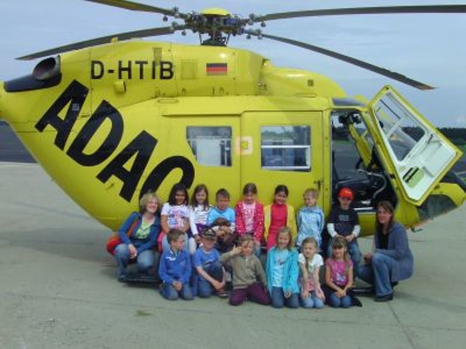 Auf dem Siegerlandflughafen konnte ein ADAC-Rettungshubschrauber, der momentan nur zu Übungszwecken verwendet wird, besichtigt werden. Die aufgeregten Kindergartenkinder durften ihn ganz genau von außen und innen inspizieren. Alle waren fasziniert von den vielen Knöpfen und Geräten, die sich im Cockpit befanden. Ein Erinnerungsfoto vor dem „tollen“ Hubschrauber und der spätere Start rundete die erste Station am Siegerlandflughafen ab.
