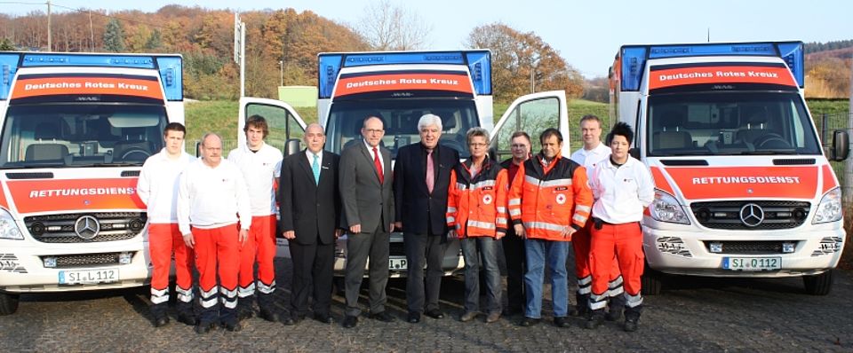Landrat Paul Breuer hat jetzt die ersten Rettungswagen einer neuen Generation an das Deutsche Rote Kreuz übergeben. Der DRK-Kreisverband Siegen-Wittgenstein führt im Auftrag des Kreises den Rettungsdienst in Siegen-Wittgenstein durch. Die Übergabe fand an der Rettungswache in Wilnsdorf statt. Die drei Fahrzeuge werden künftig in Wilnsdorf, Kreuztal und Bad Berleburg stationiert. „Im Rahmen der Neukonzeption der Fahrzeuge war es unser Ziel, bei diesen Fahrzeugen den Patientenkomfort und zugleich die Sicherheitsstandards zu erhöhen“, so der Landrat.