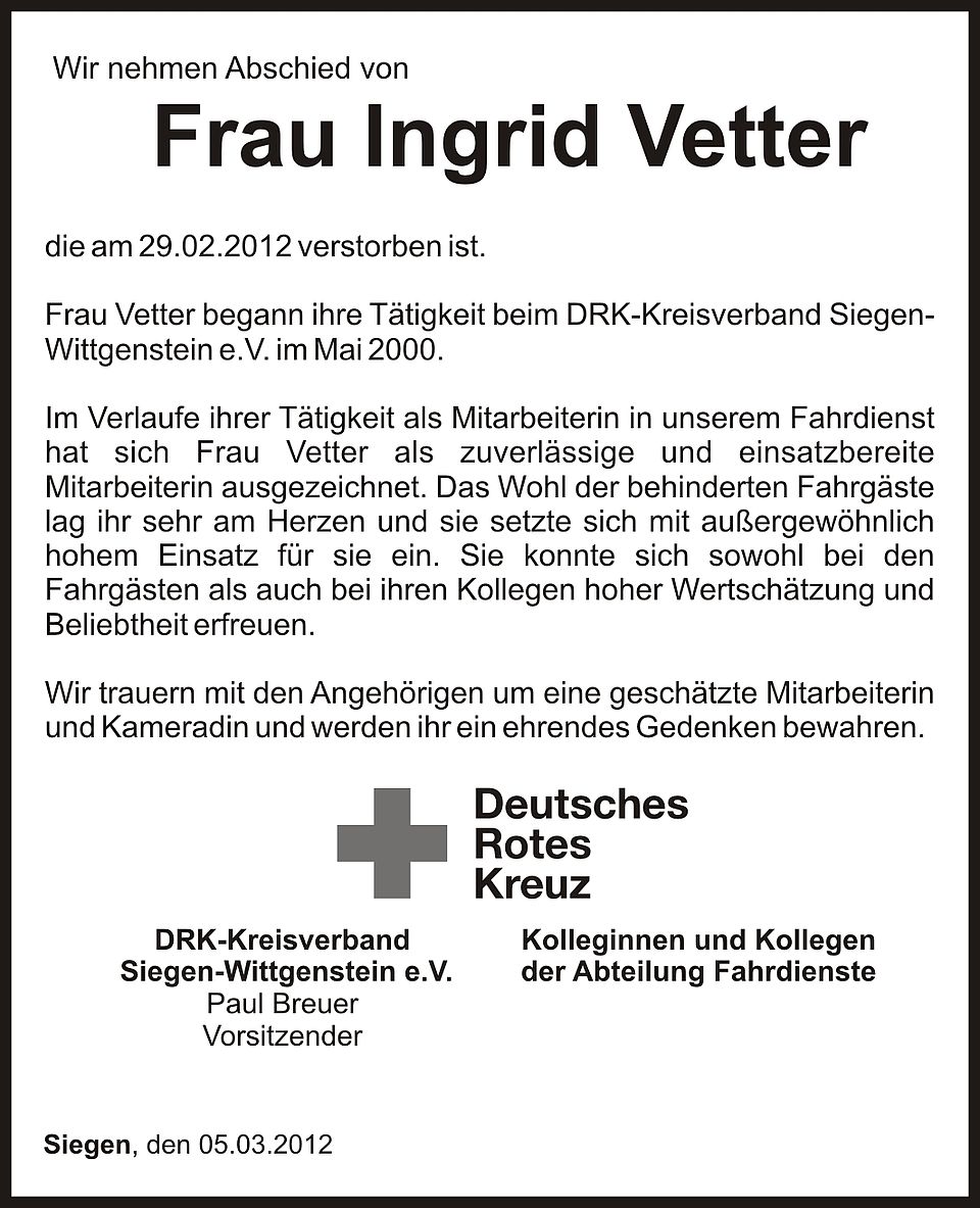 Frau Vetter begann ihre Tätigkeit beim DRK-Kreisverband Siegen-Wittgenstein e.V. im Mai 2000.