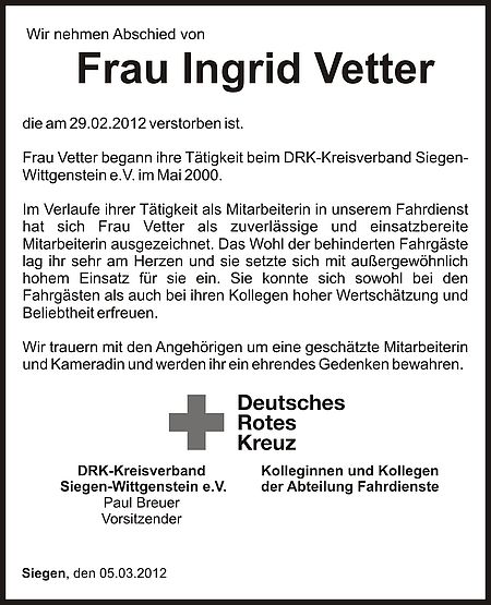 Wir nehmen Abschied von Frau Ingrid Vetter die am 29.02.2012 verstorben ist. Frau…