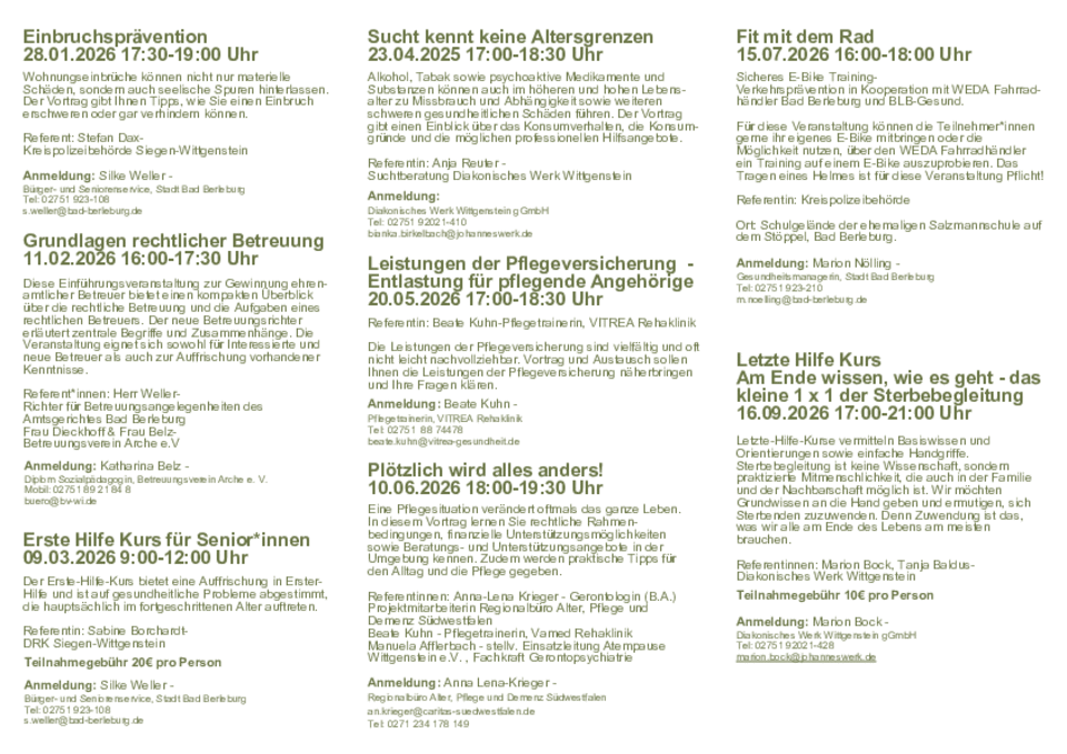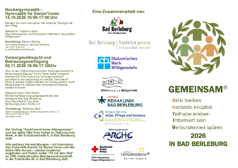 | Seniorenfrühstück | › Senioren-Frühstück in Kooperation mit der Senioren-Service -Stelle der Stadt Bad Berleburg, kostenlos, Teilnahme-Anmeldung erforderlich | 1x im Quartal Donnerstags 9:00 – 11:00 Uhr |